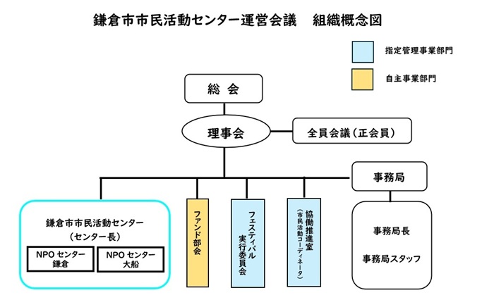 NPO法人 鎌倉市市民活動センター運営会議の組織は、法人の最高意思決定機関である「総会」と 業務執行機関である「理事会」の下で、 具体的活動の実施機関として次のような部会組織で構成されています。